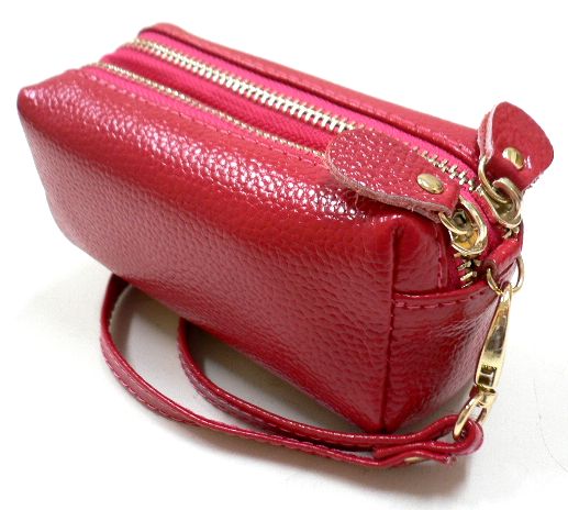 - 牛革Wファスナー レザーポーチ ピンク/携帯.タバコ.小物の収納やペンケースに