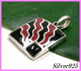- シルバー925銀の天然石オニキス×コーラル ミニ プレート ペンダント