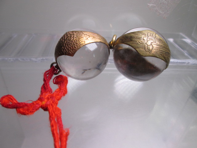 - ☆本水晶玉 2,45&2,35cm彫金細工菖蒲と菊花の枠飾り根付 2点で