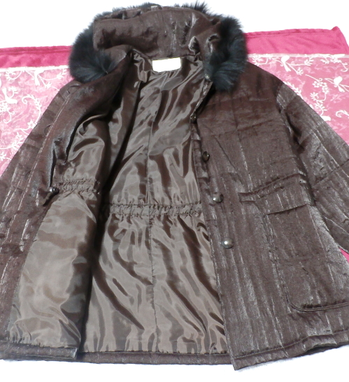 - こげ茶色のフード付き光沢フワフワあっかたコート/外套 Dark brown hooded glossy fluffy coat