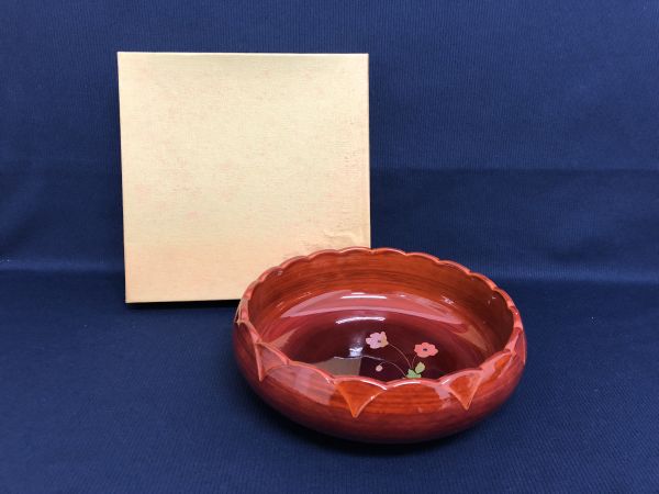 - 未使用品★美乃 漆器 ひまわり鉢 木目春慶 美人草 中鉢 箱あり管理1803 I-4