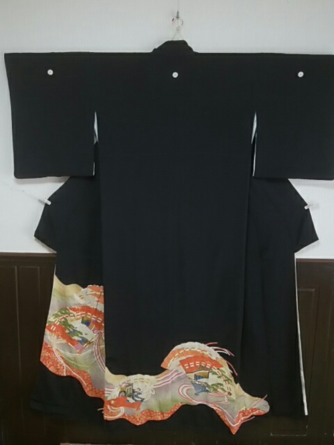 - [黒留袖]正絹/袷/身丈157cm/剣片喰/金箔金糸/面檜扇