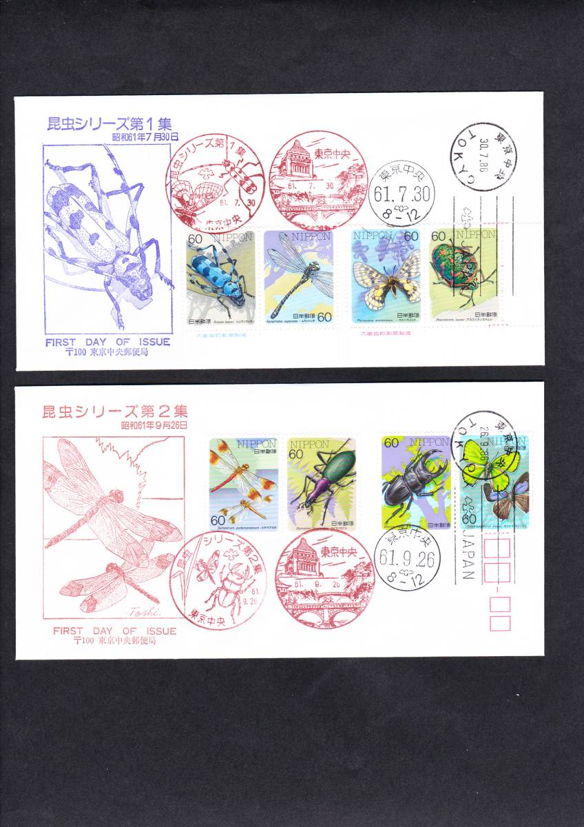 - FDC 1986-87年 昆虫シリーズ 全5集完+小型シート 6通 東京中央郵便局