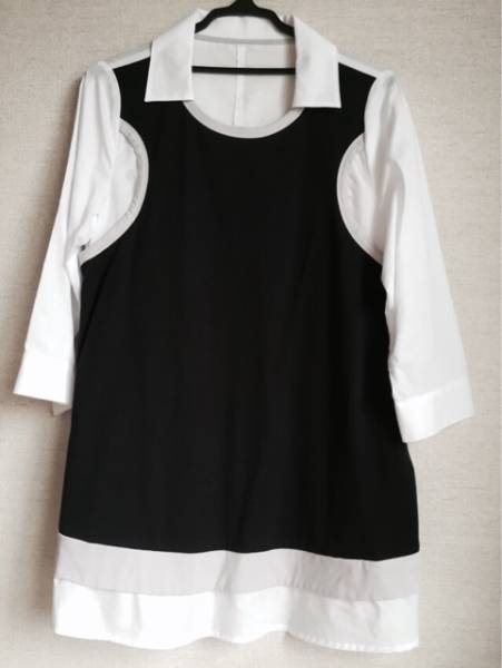 - 七分袖 ブラウス シャツ 白 紺 Aライン チュニック 美品 * シンプル