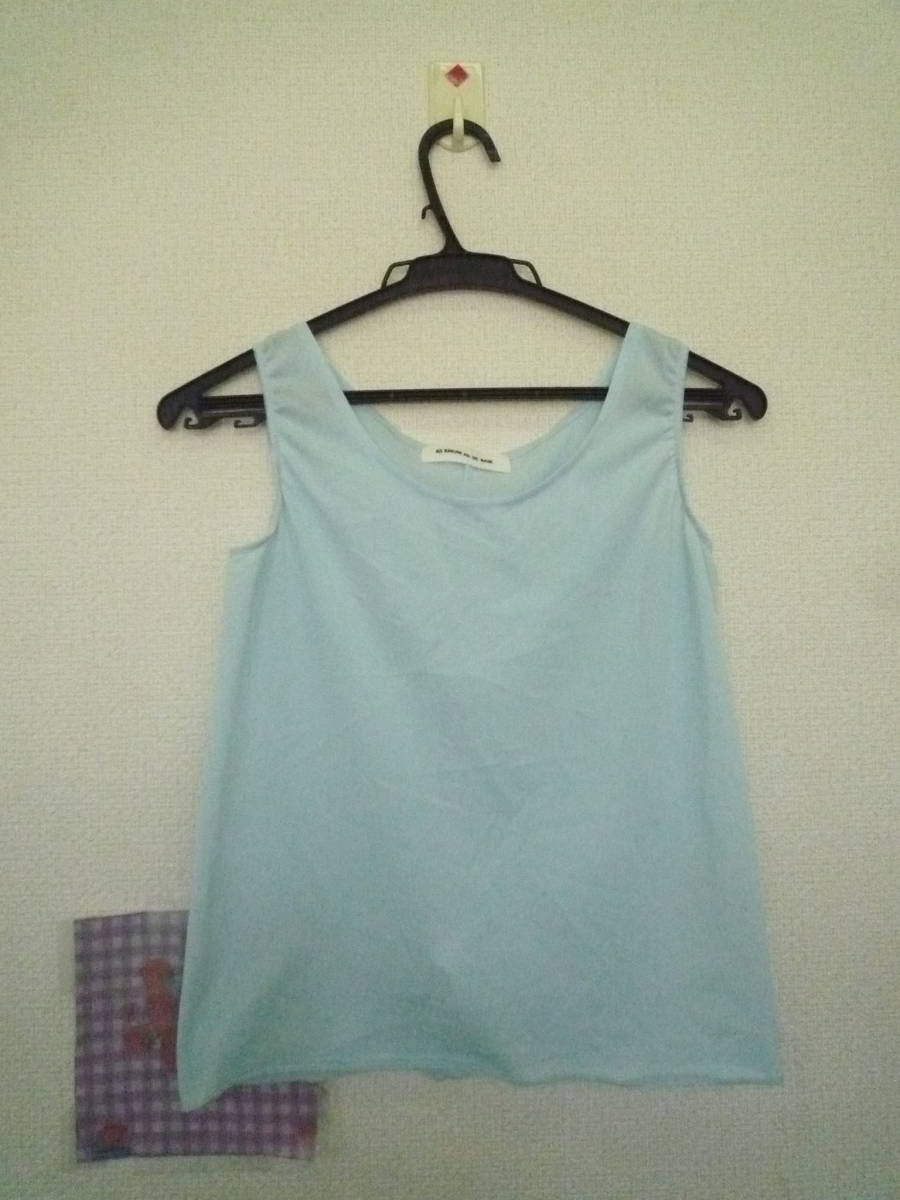 - ★ AS KNOW AS DE BASE 3枚はぎ ノースリーブ 袖ぐりゴムシャーリングトップス 透け感ストレッチ素材 水色 サイズM?
