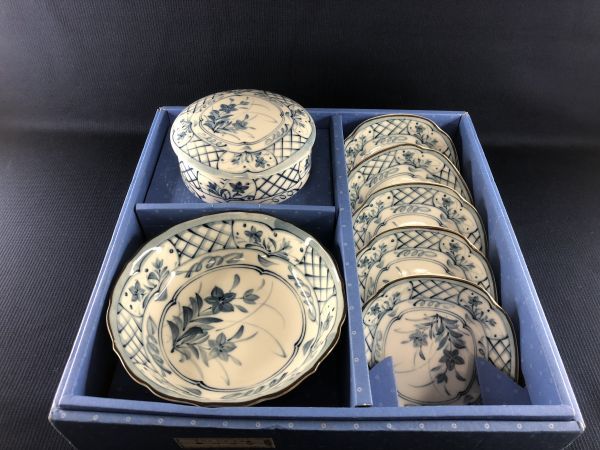 - 未使用品★ 古染桔梗 ファミリーセット 蓋付き鉢 1客 中鉢 1客 小皿 5枚 セット 箱あり管理1805 I-13