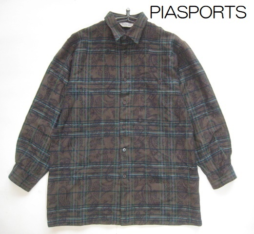 > 高級2.6万!!PIASPORTS RAIKA ライカ*ペイズリー柄&チェック柄 総柄長袖ウールシャツ 実寸S カーキ