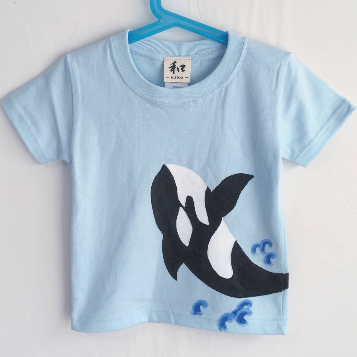 > キッズ Tシャツ 150サイズ ブルー シャチTシャツ 手描きで描いたシャチのTシャツ 半袖 動物 子供服 ハンドメイド