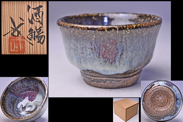 > 河井武一 ★ 灰釉ぐい呑 ★ 共箱 ★ 斑釉の様な景色の重厚感のある上手作 ★ 師:河井寛次郎 ★ 民芸 ★検 河井博次 河井敏孝 ★