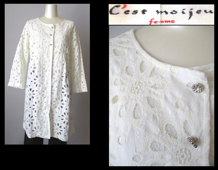 - 【001-49】Cest moijeuセモア★アイボリーホワイト透かし花モチーフロングジャケット/日本製