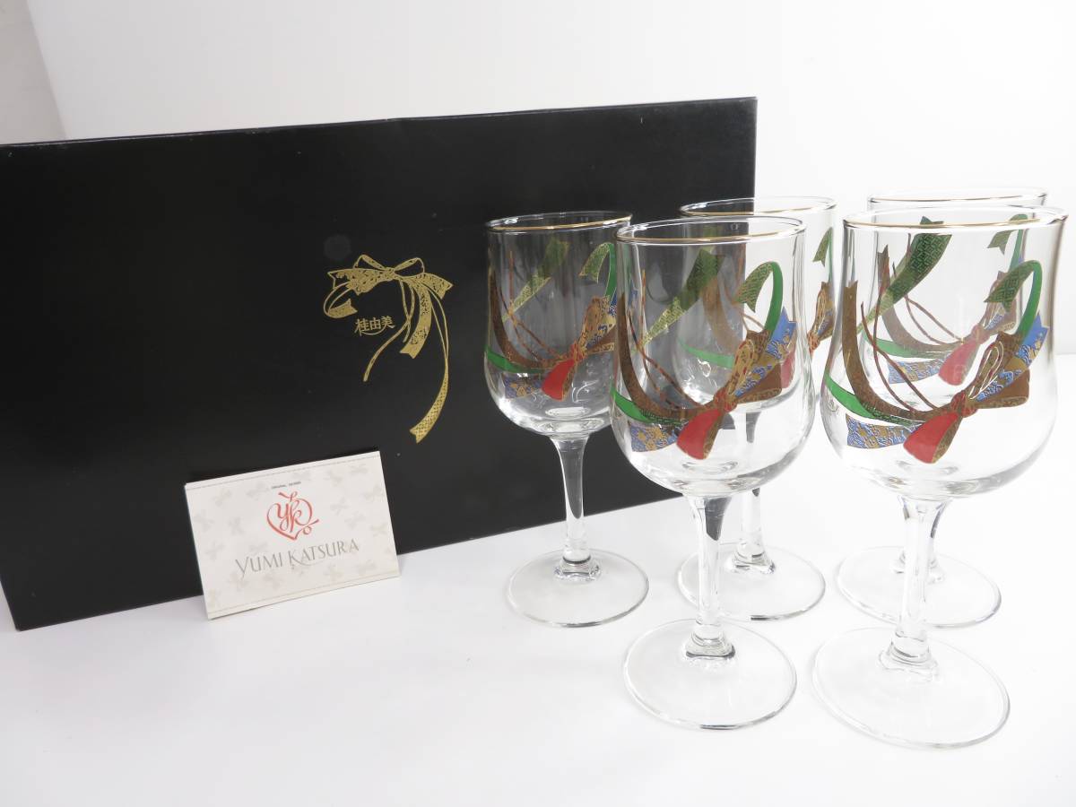 > 未使用品▲YUMI KATSURA 桂由美 ワイングラス リボン 金縁 5客セット 箱あり 管理2005 S-5