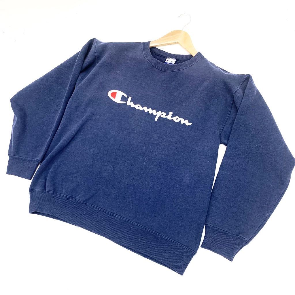 > Champion ☆ 90s レトロ系 定番 ロゴ プリント スウェット シャツ トレーナー M ネイビー 古着らしい風合い◎ アメカジ チャンピオン■AD