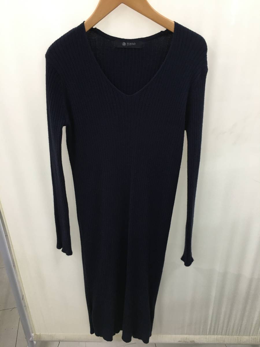 - nano universe ナノユニバース 長袖 ロング Vネック ワンピース ネイビー Fサイズ