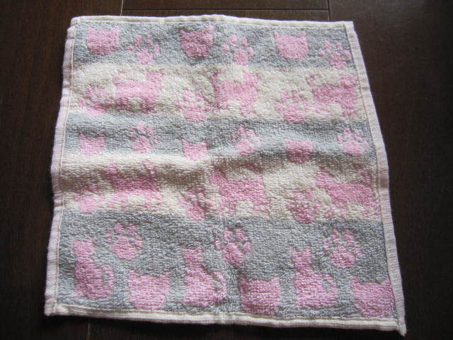 - 新品 未使用 ハンドタオル ミニタオル ハンカチタオル ピンク&グレー キャット ネコ 猫柄