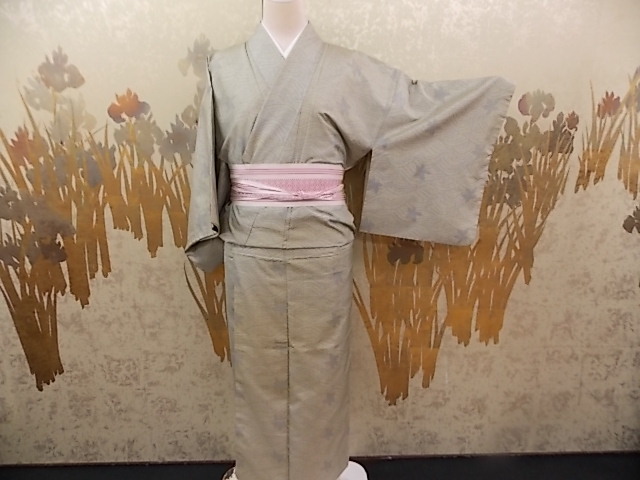 > きもの今昔14780 夏の100円バーゲン 本場大島紬袷きもの 緯総絣(よこそう)横糸にだけ絣 薄グリーンにさざ波に落ち葉