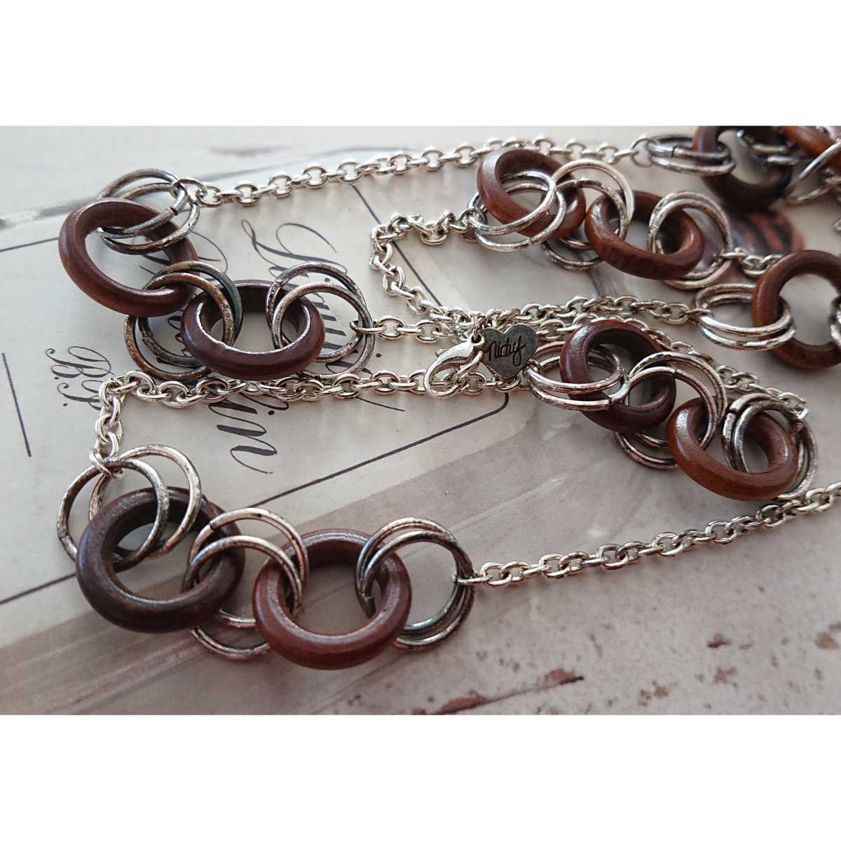 - □訳あり□ウッド調リング×シルバーカラーリングのロングネックレス□シルバーカラーチェーン□