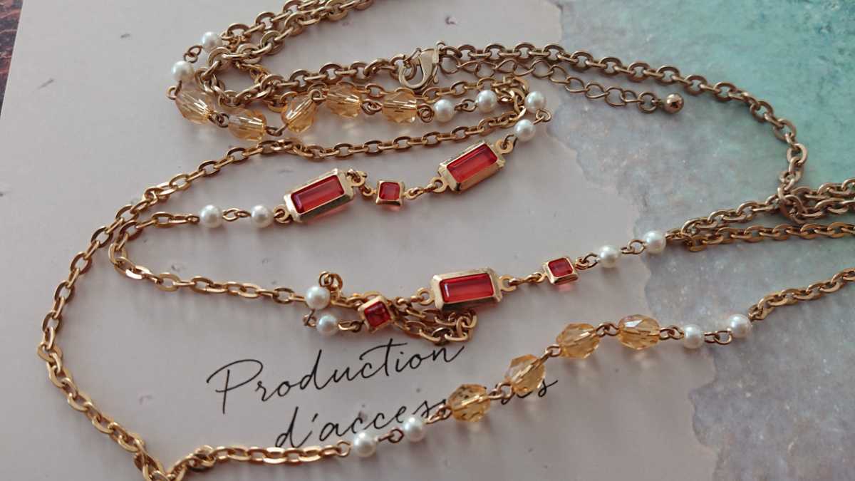 - □ゴールドカラー×オレンジカラービジュー×パール・イエロービーズのロングネックレス□