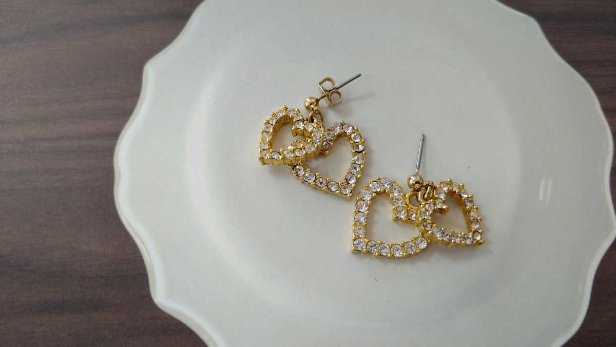 - □キュートな印象□ゴールドカラー×2連ハート・ラインストーンのピアス□