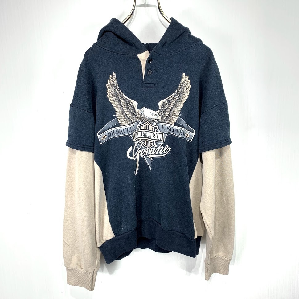 > USA製 90S Harley-Davidson ハーレー ダビッドソン パーカー Mサイズ ブラック ベージュ スウェット ヴィンテージ アメリカ イーグル ロゴ