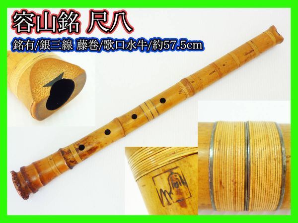 > 必見 容山 銘有 尺八 銀継 藤巻 銀三線巻 歌口水牛 刻印 在銘 約57.5cm 中継 竹製 内部漆 旧家蔵出 伝統 狂言 雅楽 能 和楽器 マニア_S7