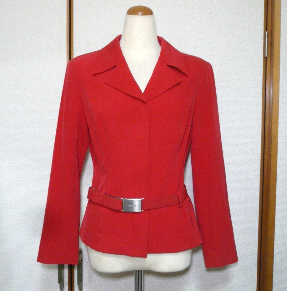 ボッシュ(BOSCH)のベルト付ジャケットです。カラーは赤(レッド)。ジッパー式。Mサイズ。実寸:肩幅41cm、袖丈57.5cm、着丈55cm。<素材>表地:ナイロン95%、ポリウレタン5%。裏地:ポリエステル100%。薄手の肩パッドが入っています。日本製。共布あり。右袖口のジッパーの引き手が取れてなくなっています。