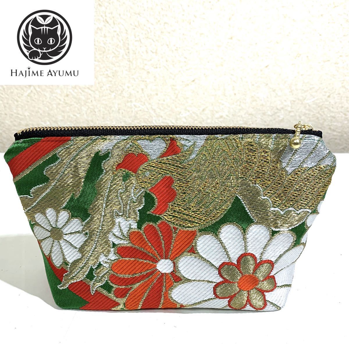 > 【現品1点のみ!!】HAJIME AYUMU 高級柄付き着物帯リメイクカジュアルデザインポーチ ハンドメイド 和風 小物入れ グリーン 鳥 花柄 和柄