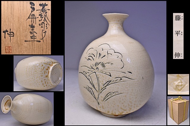 - 藤平伸 ★ 華絵彫紋扁壷 ★ 共箱栞 ★ 師: 清水六和 ( 清水六兵衛 6代 ) ★ 李朝風 ★ 落ち着きのある逸品 ★検 藤平寧 ★