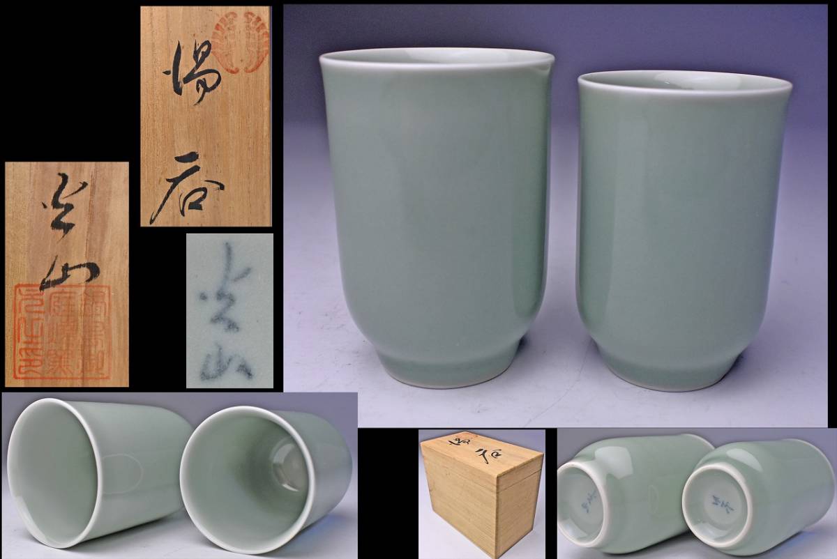 > 市川光山 ★ 鍋島青磁 湯呑 一対 ★ 共箱 ★ 鍋島御庭焼 鍋島藩窯 抱き茗荷 印 ★ 気品ある逸品 ★