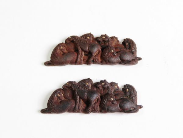 - 【1741】明治時代 煙草入れの前金具 鉄地 群馬図金具2点(煙草入金具・腰堤・コレクター一括買取品)