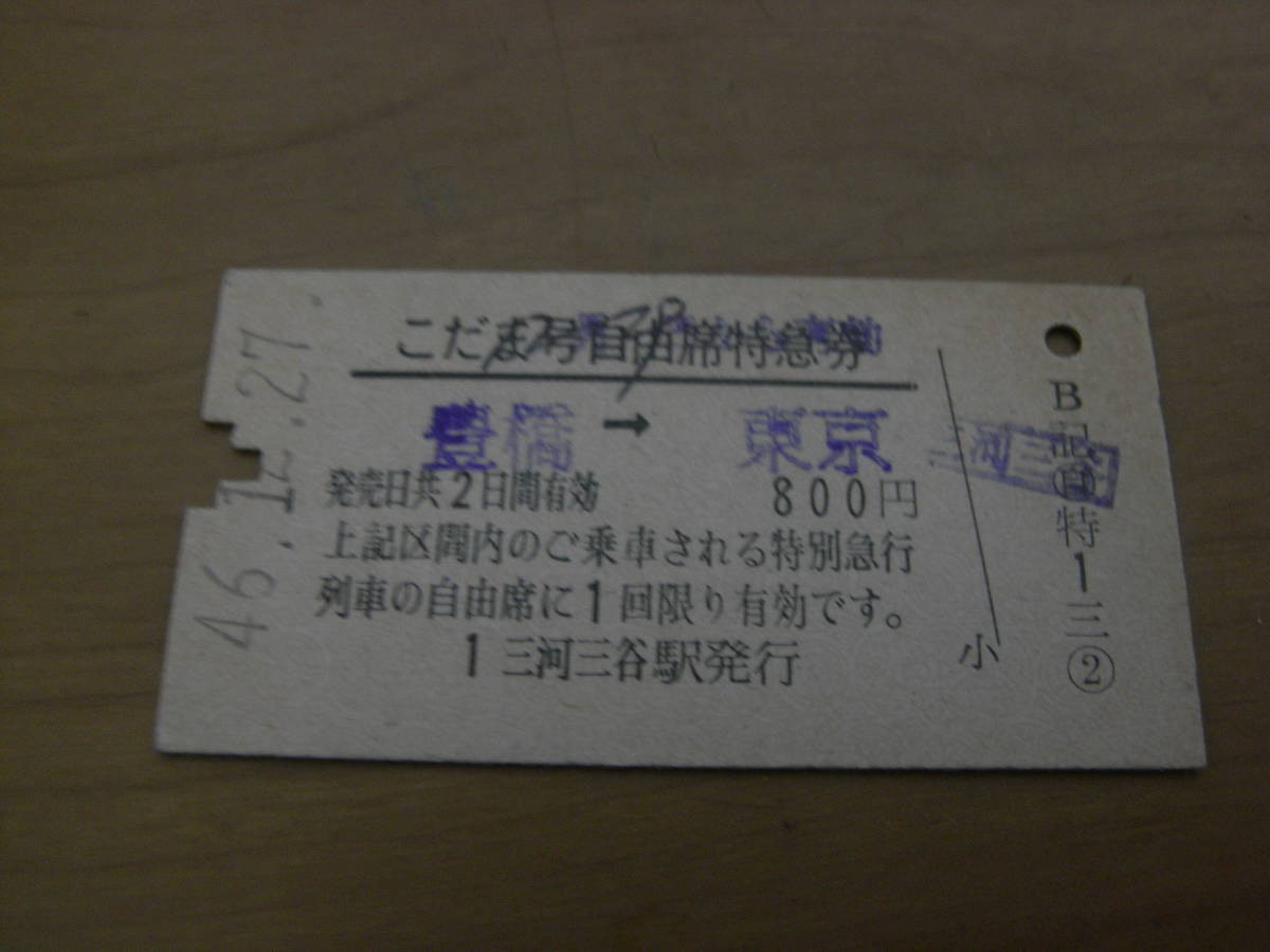 - こだま号自由席特急券 豊橋→東京 昭和46年12月27日発行 三河三谷駅発行