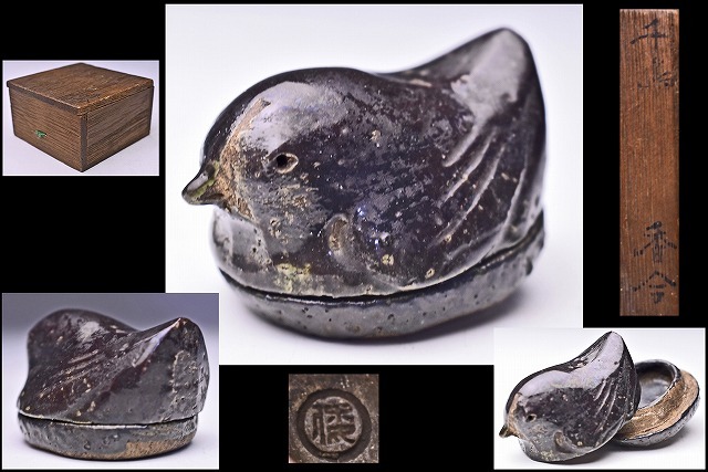 - 在印 ★ 黒 千鳥 香合 ★ 小品ながら独特の存在感があり作者の陶技の高さが感じられる逸品 ★ 黒楽風 瀬戸黒風 ★ 香道具 茶道具 ★