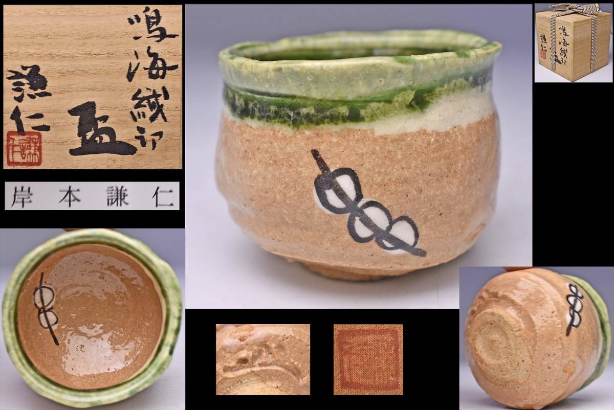 - 岸本謙仁 ★ 鳴海織部盃 ★ 共箱共布栞 ★ 検 伊賀 青瓷 酒器 ぐい呑 信楽 ★