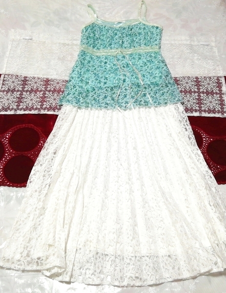 > 色緑花柄フリルレースキャミソール ネグリジェ 白レースロングスカート 2P Blue green flower pattern camisole negligee white lace skirt