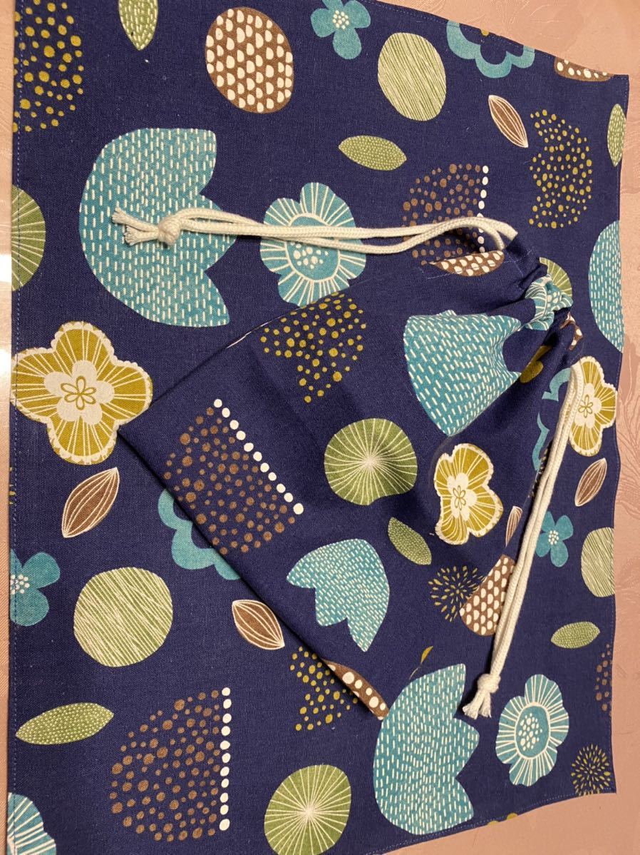 > No.348 裏付ランチョンマット&巾着 ハンドメイド 35x45 青色北欧花柄