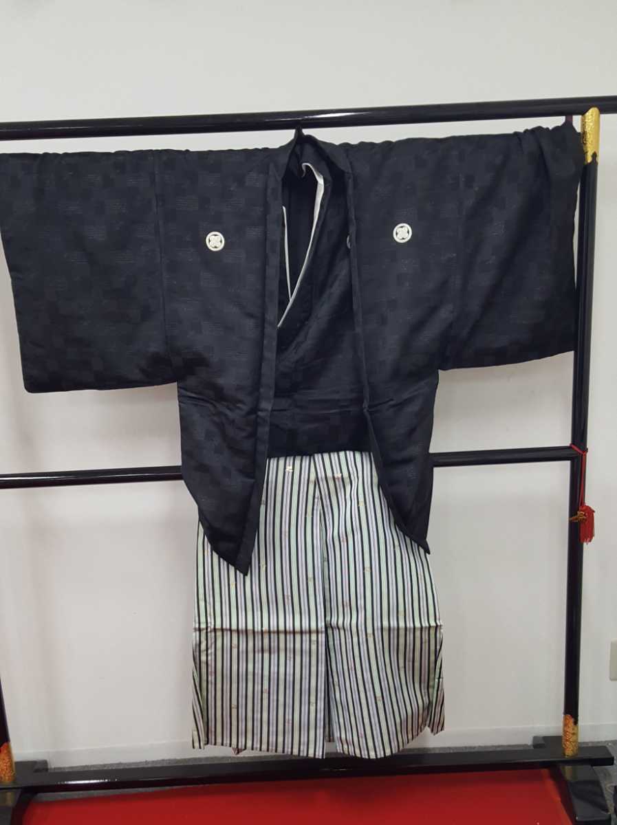 - 岩⑫)三点セット クレージュ courreges 袴 男性 男性用 着物 羽織セット 刺繍 成人式 式典 結婚式 ストライプ 黒 青20211209