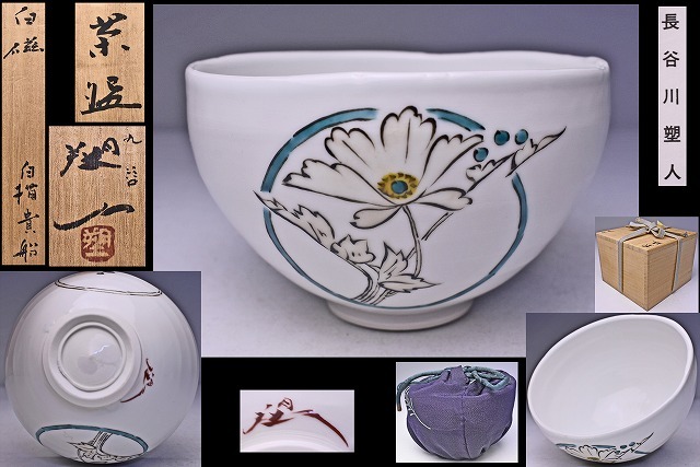 > 長谷川塑人 ★ 白磁 白描 貴船 茶碗 ★ 共箱 栞 仕覆 ★ 縁: 中村梅山 ★ 美しい肌に絵付の愛らしい逸品 ★ 九谷焼 茶道具 ★