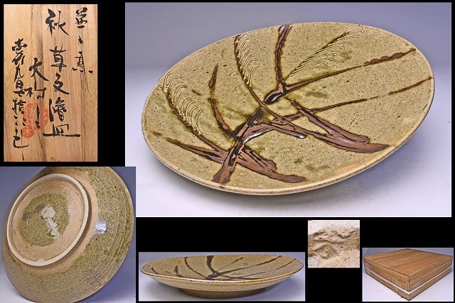> 木村一郎 ★ 秋草文 絵皿 ★ 共箱 ★ 豪快でスッと描かれた草文に風を感じる逸品 ★ 益子焼 民芸陶 ★検 木村充 ★
