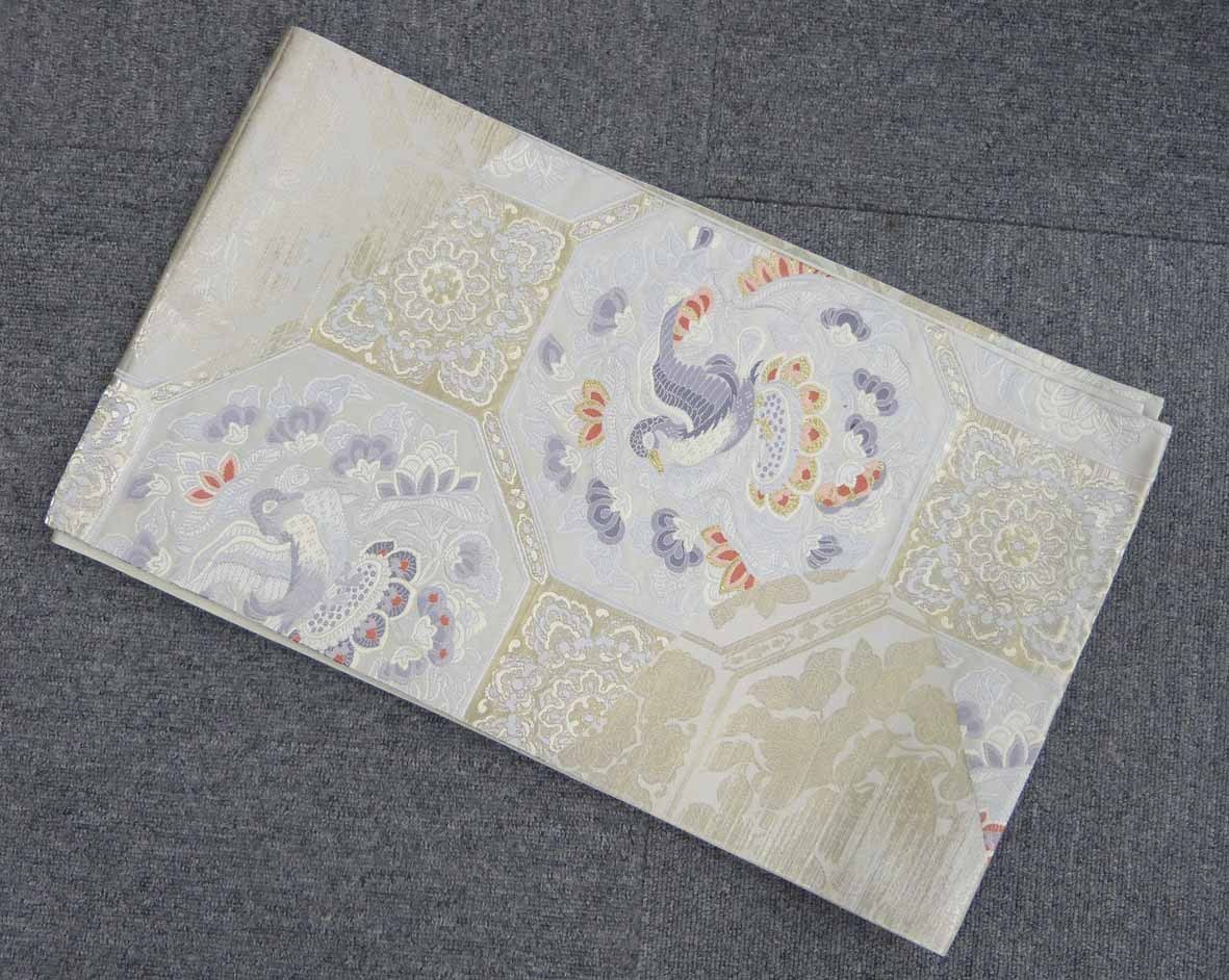 > ☆袋帯 蜀甲花鳥文 二重箔 金糸 銀糸 正絹 婚礼/訪問着 仕立て済み 31cm×425cm USED品☆