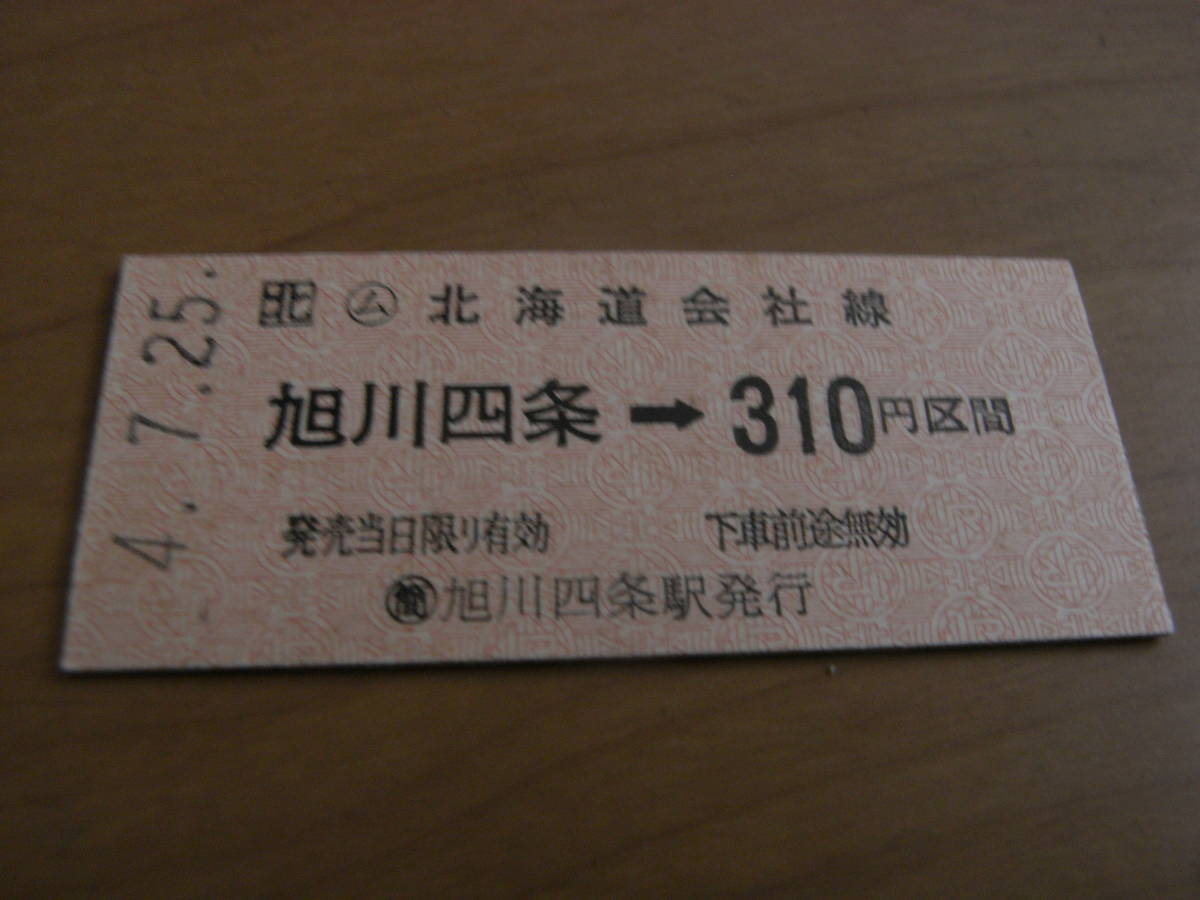 - 宗谷本線 ム旭川四条→北海道会社線310円区間 平成4年7月25日 簡 旭川四条駅発行