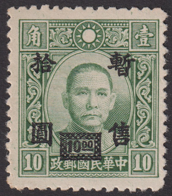 - 中国占領地切手 華中 暫售加刷 大東版孫文票 すかしなし 10円/10分 目打:12・1/2 未使用 NH JPS:8C55b 0619