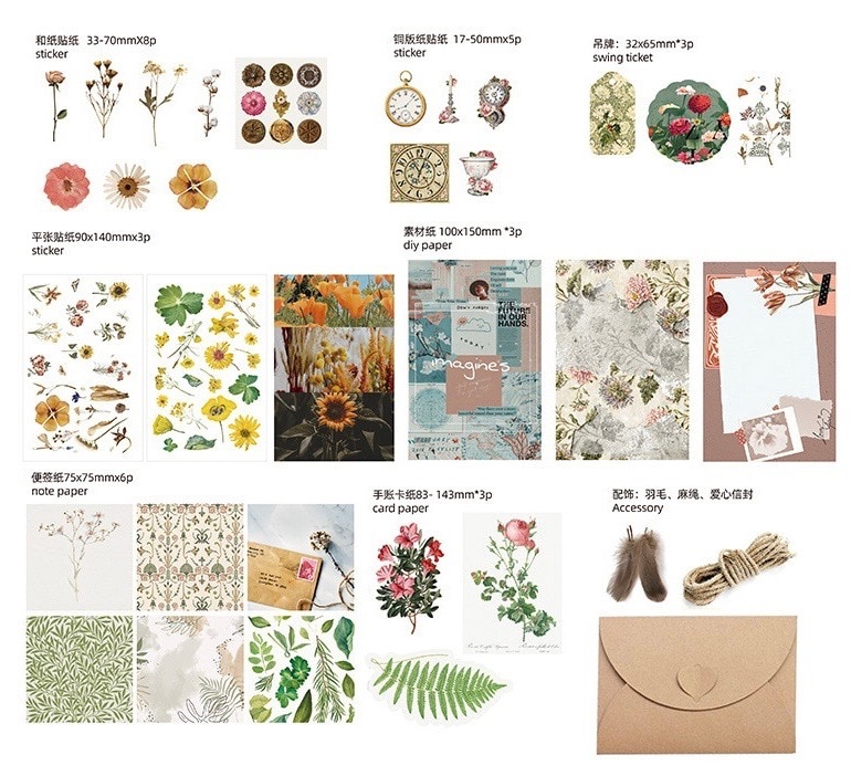 > ◆海外 素材紙・シールセット メモ 背景紙 No7-3 草花・植物・自然 おすそ分け・手帳・日記・ジャンクジャーナル・コラージュに