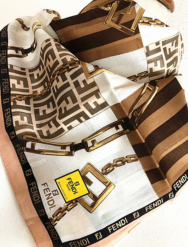 - 新品 フェンディ FENDI 正規品鑑定済み◆レア柄ダブルFズッカ柄ストライプ&英字織り大判ハンカチミニスカーフ★膝掛け (0307D32500)
