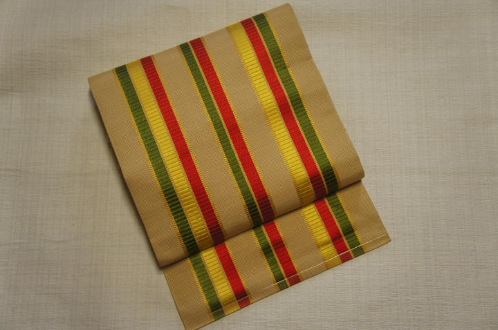 - 正絹ベージュ色地縞模様未着用名古屋帯[N12248]