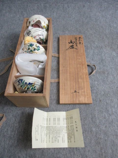 - 【政】30993 九谷焼野草文絵変り御盃 5客 九谷 剛 銘 共箱 骨董 古物
