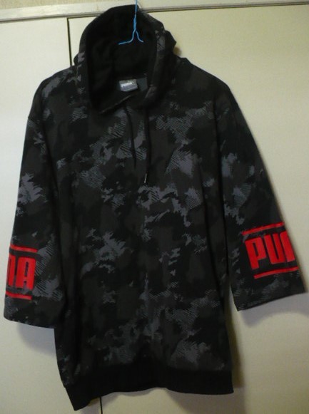 > 美品 PUMA(プーマ)製CP AOP SSフーディ(フード付き半袖パーカー) M 黒 カモフラージュ(迷彩)柄 品番845120