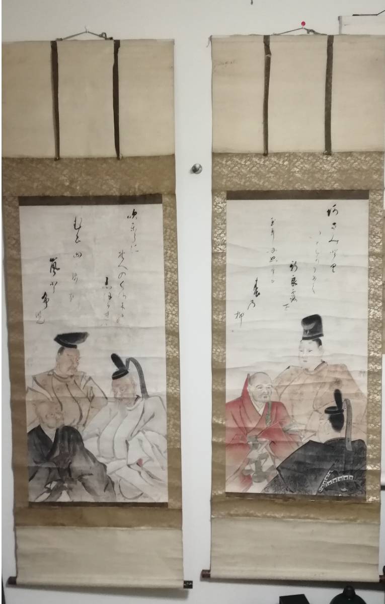 - 大幅 一対 歌会の画 仏画 大宮人 詩 堆黒 倶利 軸 サイズ:60x190 2幅