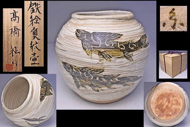> 高橋紘 ★ 鉄絵 魚紋 壺 ★ 共箱 ★ 中国 磁州窯 を思わせる意匠で勢いのあるたっぷりとした刷毛目に氏らしい魚紋が活き活きとした逸品 ★