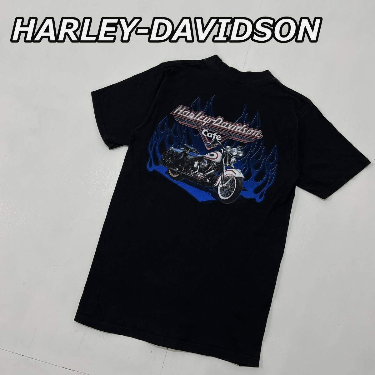 - 【HARLEY-DAVIDSON】ハーレーダビッドソン フレイム バイク バックプリント クルーネック ポケット Tシャツ 黒 ブラック