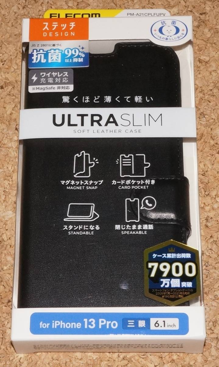 > ★新品★ELECOM iPhone13Pro レザーケース Ultra Slim ステッチ 抗菌 ブラック