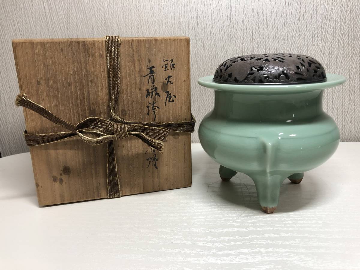 - 平安魯山 青磁袴腰香炉 香爐 銀火屋 純銀 60g 蓋付 共箱 三足 香炉 茶道具 花 陶磁器 お香 置物 オブジェ シルバー